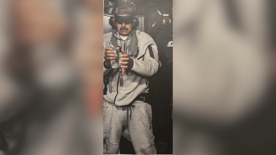 O presidente dos Estados Unidos, Donald Trump, publicou neste sábado(3) uma foto do líder venezuelano deposto, Nicolás Maduro, algemado e com os olhos cobertos por óculos